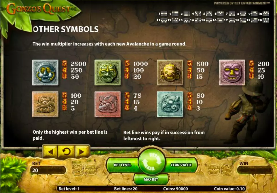 Gonzo’s Quest предлагает уникальную игровую механику — функцию Avalanche, в которой символы не вращаются на барабанах, а падают на место. Выигрышные символы взрываются и освобождают место для новых, что может привести к нескольким выигрышам подряд. Каждый последующий выигрыш увеличивает множитель, повышая потенциальный выигрыш.